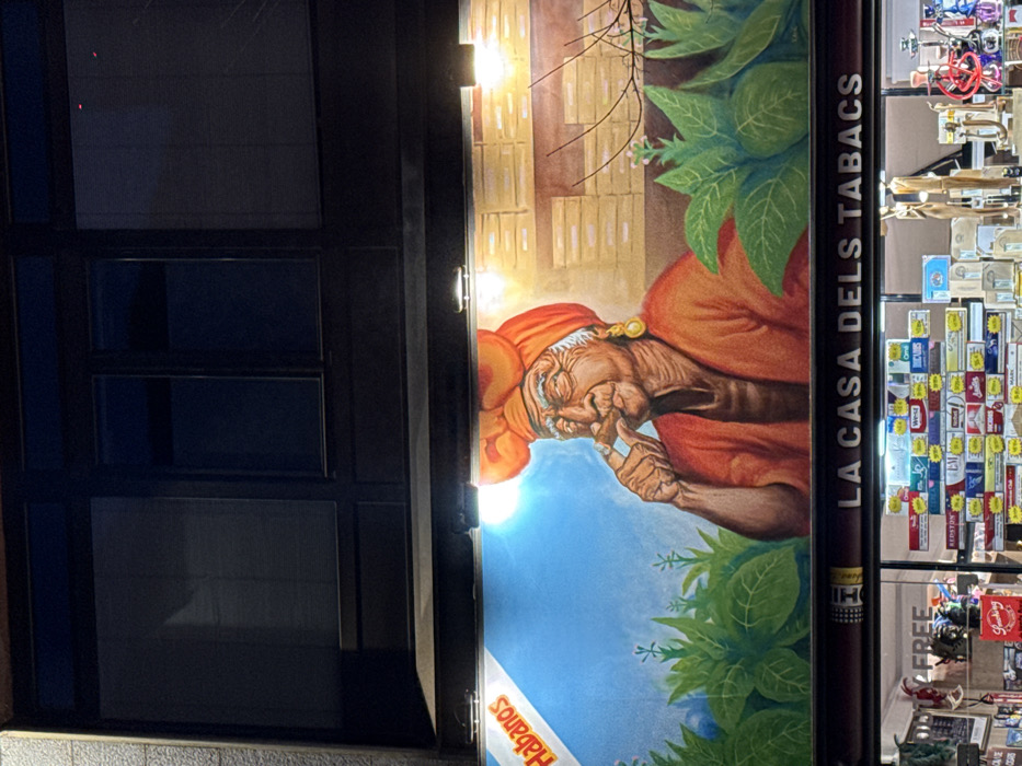 A colorful mural depicts an elderly woman in orange attire smoking a cigar, surrounded by lush green leaves against a light blue and brown backdrop. The mural is part of a storefront sign that reads "LA CASA DELS TABACS" vertically. Adjacent to the mural, inside the store, shelves are filled with various brands of cigarettes and smoking-related items, including miniatures and signage advertising "FREE". A dark-framed window is visible to the left.