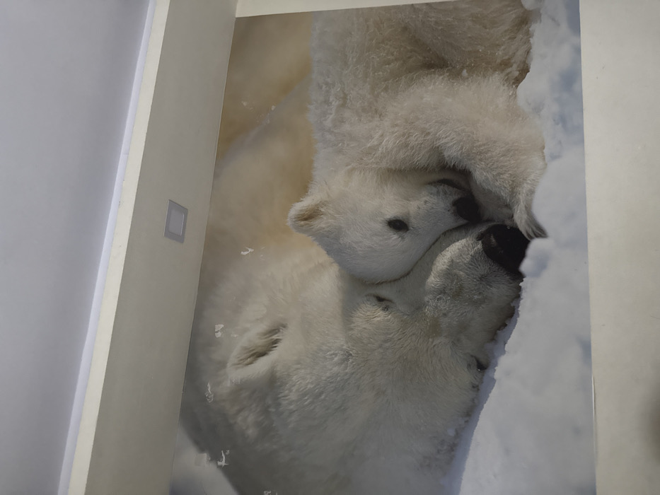 This image displays a photograph of an interior wall in Tbilisi, Georgia, featuring a large wall mural. The mural depicts an adult polar bear and a polar bear cub lying together on a snow-covered ground, appearing to be resting or asleep. The adult bear, positioned on the left, has white fur, closed eyes, and a dark snout. The cub, smaller and also covered in white fur, is nestled closely against the adult's head and neck, with its dark snout near the adult's. The background of the mural transitions from a white, snowy foreground to a soft, light cream-colored or yellowish hue in the upper sections. Several small, irregular white anomalies are present on the mural surface, predominantly above the adult bear's head and near the upper right corner, indicating surface damage or peeling. Above the mural, a cream-colored architectural beam or soffit spans the width of the frame, separating the mural wall from a flat white ceiling. A single square, recessed LED light fixture is visible in the center of the ceiling portion. A linear light strip is installed along the underside edge of the cream-colored beam, directing illumination downwards onto the mural.
