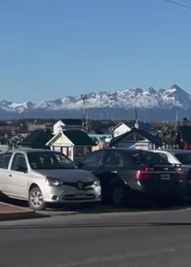 The camera pans horizontally across a street scene with a backdrop of snow-capped mountains under a clear blue sky