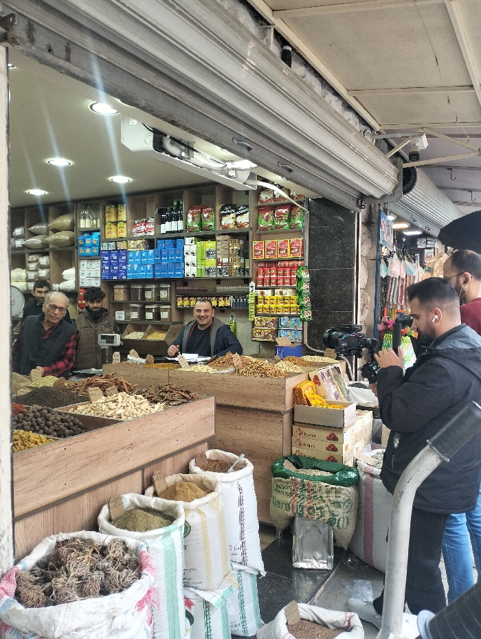 The image captures a market scene at the entrance of a shop specializing in spices and dried goods in Homs, Syria