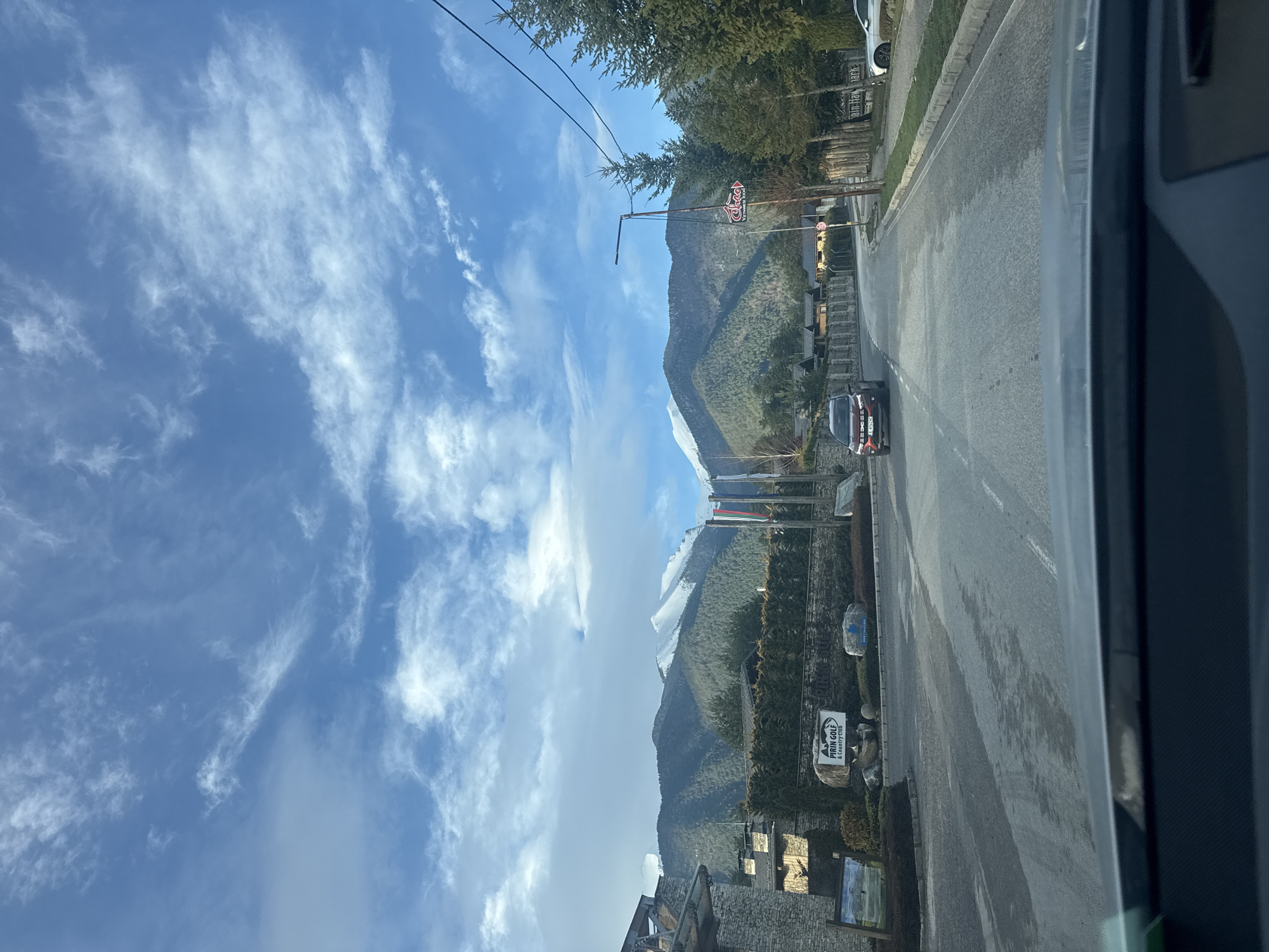 The image depicts a view from inside a vehicle, likely a car, driving down a street in an area identified as Pirin Golf & Country Club, located in the city of Unknown, Bulgaria. The sky is blue with scattered clouds. Mountains, partially snow-covered, rise in the background. A sign for the Pirin Golf & Country Club is visible on the right side of the road. A dark-colored vehicle is seen driving in the same direction ahead. The road appears to be paved and lined with buildings and trees on both sides. Power lines run overhead. The inside of the car is partially visible in the foreground.