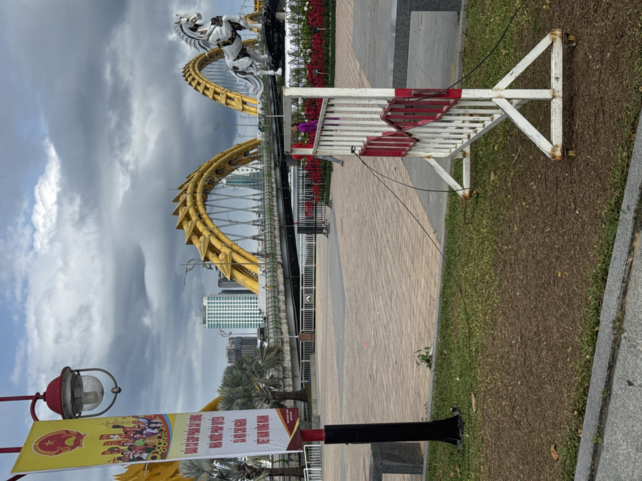 The image depicts an outdoor urban scene at the Han River waterfront in Hải Châu Ward, Da Nang, Vietnam, under an overcast sky. In the background, the golden Dragon Bridge, a prominent arch bridge resembling a dragon, spans the river, carrying light vehicle traffic. Tall, modern buildings, including a light green skyscraper, are visible beyond the bridge against a heavily clouded sky. In the midground, a spacious public square paved with light brown interlocking pavers extends toward the river. A large, stylized white horse statue on a dark base is positioned to the right, surrounded by beds of red flowering plants. Two individuals are present on the paved area: one person in a purple top walking towards the left, partially obscured by a foreground barrier, and another person in a red shirt further to the left. In the left foreground, a red pole with an attached red vintage-style street lamp supports a yellow vertical banner. The banner displays the Vietnamese emblem, stylized human figures, and Vietnamese text. In the right foreground, a white and red portable metal barrier with wheels, featuring red diamond patterns, rests diagonally on a strip of sparse, dry grass and soil. Black electrical cables are visible lying on the grass, extending towards the barrier. A grey curb separates the grass from the paved square.