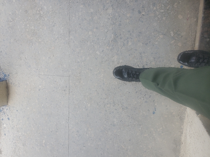 The image presents a first-person, downward view of a person's lower legs and feet. The individual wears dark green trousers and black, lace-up combat or work boots. The right leg and boot are centrally positioned on a light gray, speckled floor, which appears to be terrazzo or concrete tiles with visible grout lines. The left boot is partially obscured by a low, light-colored step or curb located at the bottom of the frame. Scattered, faint blue paint marks are visible on the floor surface. The environment is an unidentifiable indoor or semi-enclosed utilitarian space within the city of Unknown, Unknown, likely a public building, institution, or commercial area, characterized by its durable flooring. The person is static or paused. No other individuals or specific interactions are depicted.