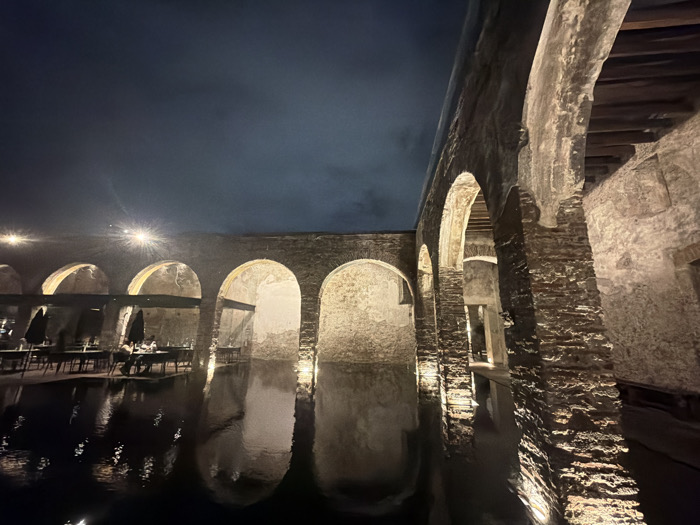 The image displays a nocturnal view within a renovated historic arcaded structure, centered around a large, still body of water
