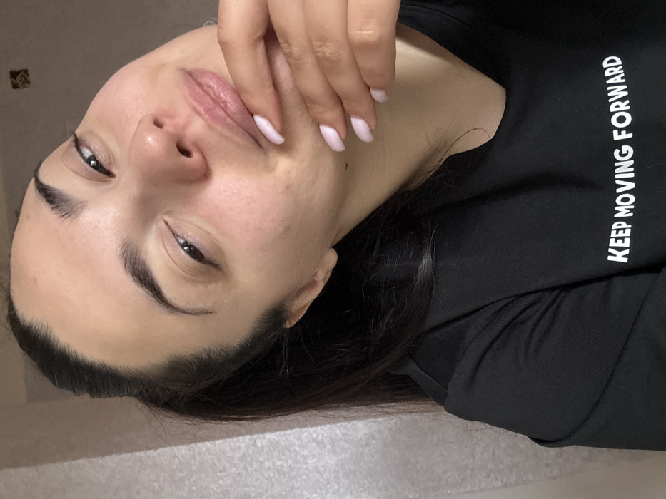 A female subject, likely an adult, is depicted in a close-up, chest-up shot. Her dark hair is pulled back, forming a ponytail visible on the left side of the frame. She has dark, full eyebrows and dark eyes, which are directed slightly upwards and to the viewer's left. Her lips are slightly parted in a faint smile or smirk. Her right hand, featuring nails painted with a light pink or nude polish, is positioned with the fingers resting under her chin and jawline. She is wearing a black long-sleeved top with white capitalized text across the chest that reads "KEEP MOVING FORWARD". The background is an indistinct indoor setting, with a light-colored, possibly textured wall visible on the left and a small, dark rectangular detail in the upper right quadrant. No specific geographic identifiers are present to determine a location within Sofia, Bulgaria.