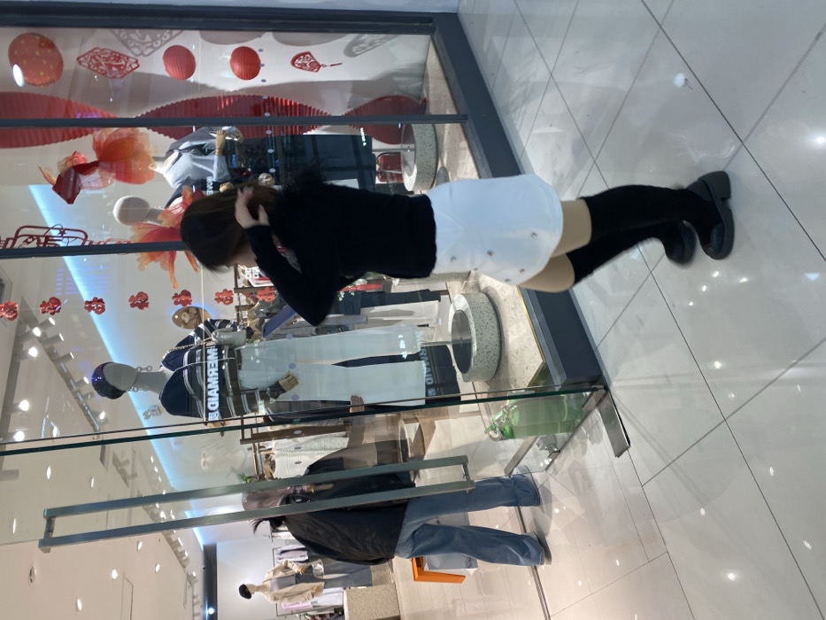 The image depicts an indoor scene within a modern commercial building, likely a shopping mall, in China, identifiable by traditional Chinese "福" (fú) character decorations and red lanterns within the shop display. The exact location within Taihe District is not discernible from the image. The foreground features a polished, light-colored tiled floor that reflects ambient light. Two individuals are present outside a retail clothing store with a large glass display window. On the right, a female is seen from a rear-side perspective. She has medium-length brown hair and is wearing a black long-sleeved top, a white mini-skirt adorned with small metallic studs, black knee-high socks, and black chunky-soled shoes. Her hands are raised towards the back of her head, possibly adjusting her hair. She is looking towards the shop window. On the left, a second individual is partially visible from behind, obscured by a glass door frame. This person is wearing a dark jacket and blue jeans. A light orange shopping bag rests on the floor near their feet. The shop's display window contains multiple mannequins showcasing clothing. A central mannequin wears a horizontally striped sweater with the word "MERMAID" visible, paired with white wide-leg pants and a dark, sequined beanie. Other mannequins in the background display additional garments. The window is decorated with red Chinese characters for "福" (fú), red lanterns, and red paper-cut motifs, suggesting a festive or Chinese New Year theme. A large, flowing orange fabric element is also part of the display. The store interior is brightly lit with white walls, and racks of clothing are visible further inside. A light green water bottle is positioned on the floor at the base of the glass partition. The glass surfaces show reflections of the interior lights and portions of the environment.