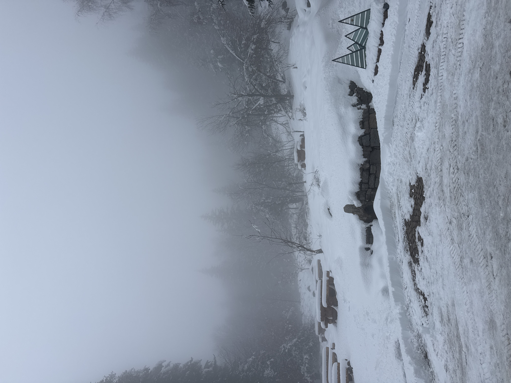 snowy landscape in Sofia, Bulgaria. The scene is shrouded in dense fog, limiting visibility. Bare trees and snow-covered evergreen trees line the left side of the frame. On the right, a snow-covered road or walkway displays tire tracks and footprints. A low stone wall borders the pathway. Three triangular, green and white striped objects are visible atop the wall. The overall environment suggests a cold, winter day.