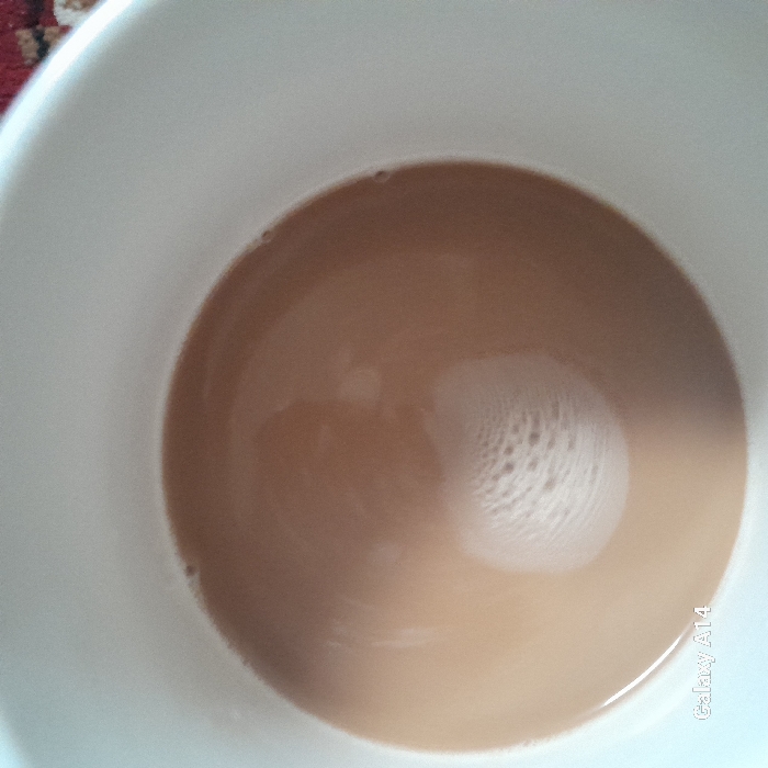 - "The image displays a close-up, overhead perspective of a light brown liquid, consistent with a beverage like coffee or tea with milk, contained within a white ceramic mug" by FM-V8KrL2, licensed under CC BY 4.0