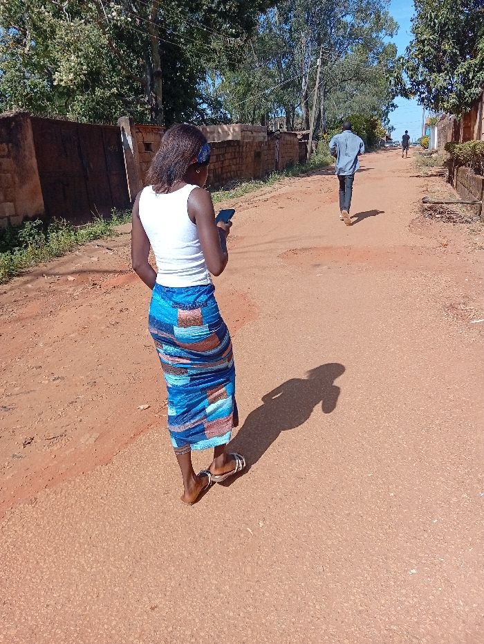 The image depicts an outdoor daylight scene on a reddish-brown, unpaved or sparsely paved road in a residential area of Jos, Nigeria. In the foreground, a female with dark hair, wearing a white sleeveless top, a blue and brown patterned wrap-around skirt, and light-colored sandals, stands with her back to the camera, holding a dark smartphone. Her shadow is cast prominently to her right. Further down the road, approximately 15 meters ahead, a male figure wearing a light blue long-sleeved shirt and dark trousers walks away from the camera, casting a shadow to his left. A third, less distinct individual is visible walking further down the road in the background. The road is flanked by low walls constructed of concrete blocks or mud bricks, with green trees and foliage visible behind them and in the distance under a clear blue sky.