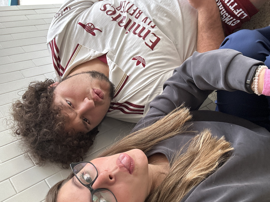A high-angle selfie depicts two individuals, one female and one male, positioned closely together against a light-colored, horizontally tiled or paneled wall. The female, situated in the foreground on the left, has long light-brown hair, wears black-framed glasses, and a gray long-sleeved top over blue pants. A black fitness tracker is on her left wrist, and a white beaded bracelet with a pink wristband is visible on her right wrist area. She is seen sticking her tongue out towards the camera. The male, positioned behind and to the right of the female, has curly dark brown hair and facial hair. He wears a white collared short-sleeved shirt featuring red and gold stripes on the shoulders, an Adidas logo, an Arsenal FC crest, and "Emirates" text across the chest. He is looking towards the camera with a pouting expression and furrowed brows. A red fabric item with "GYMSHARK LIFTING" in white text is visible on his lower right leg. The specific location within Interlomas, Mexico, cannot be determined from this image.