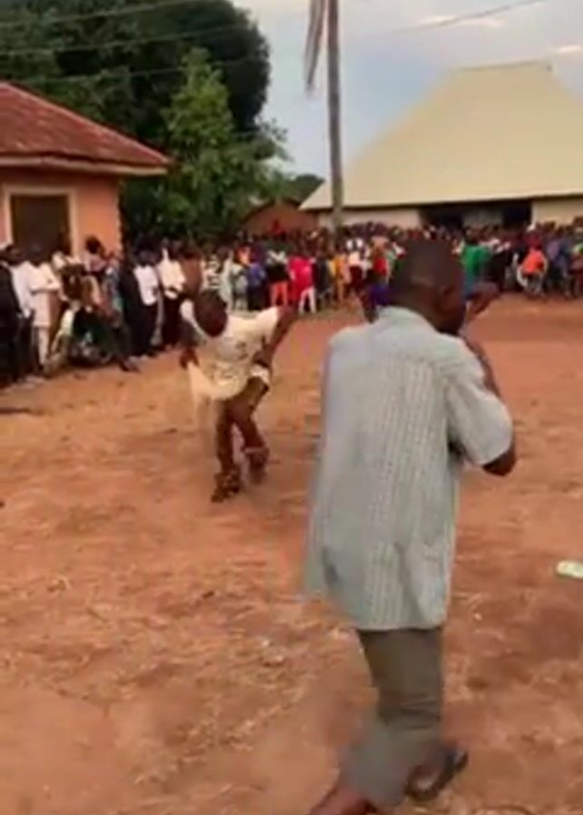 two men dancing in a circle of dirt. The man on the left is wearing a white shirt and tan shorts, with something around his ankles. The man on the right is wearing a blue polo shirt, white pants, and a red baseball cap, also with something around his ankles. A crowd of people stands around the perimeter of the circle watching the two men dance. There are buildings and trees in the background. The sky is overcast.