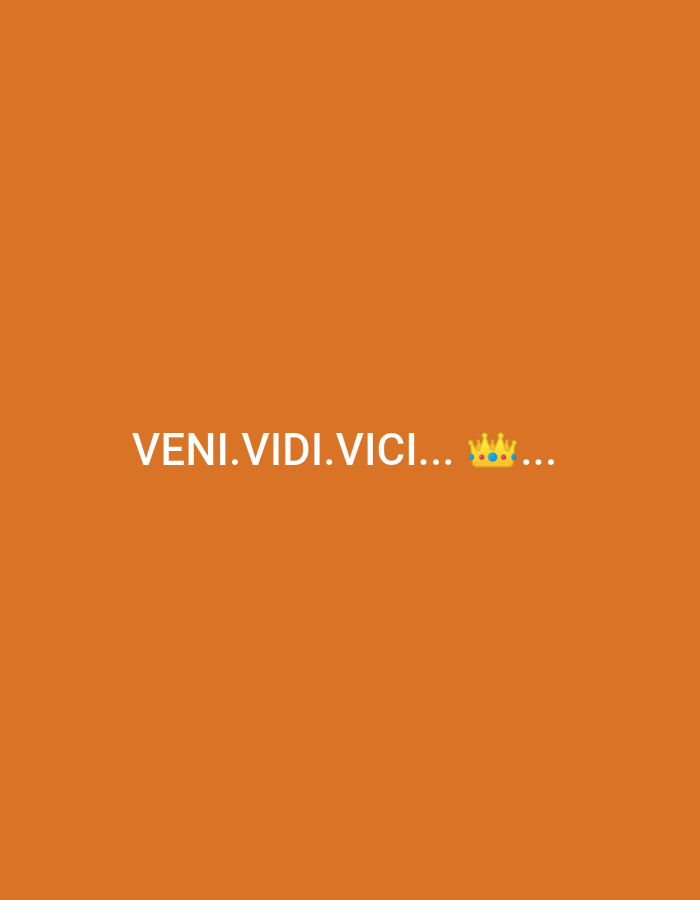 The image displays a digital graphic on a solid orange background. Centered horizontally in the upper middle portion of the frame is white text that reads "VENI. VIDI. VICI...". Following the text, there is an emoji of a golden crown adorned with three blue and two red circular jewels. Three ellipsis dots trail the crown emoji. No physical location within Thika Township ward, Kenya, or any other specific environment, people, actions, or interactions are visually depicted in this image.