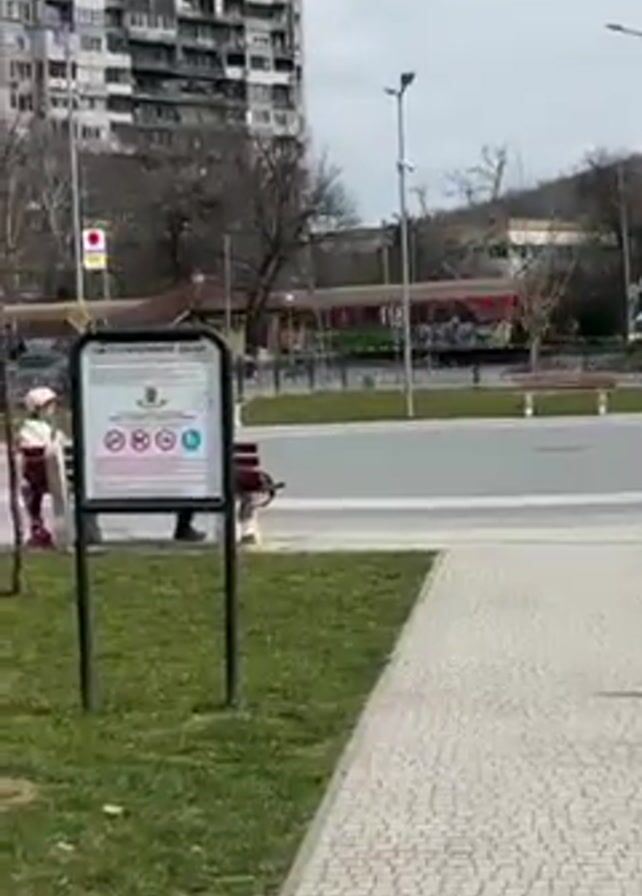 The camera captures a scene in a park or public square on a partly cloudy day. In the foreground, there's a brick-paved walkway, and on either side are patches of green grass. A sign with symbols and text stands on the left, indicating regulations or information about the area. In the background, there's a large, multi-story apartment building. The area is populated with people. Some are sitting on benches, while others are walking or biking. A red bus is visible in the background as well. The bare trees suggest it's either late fall or early spring.
