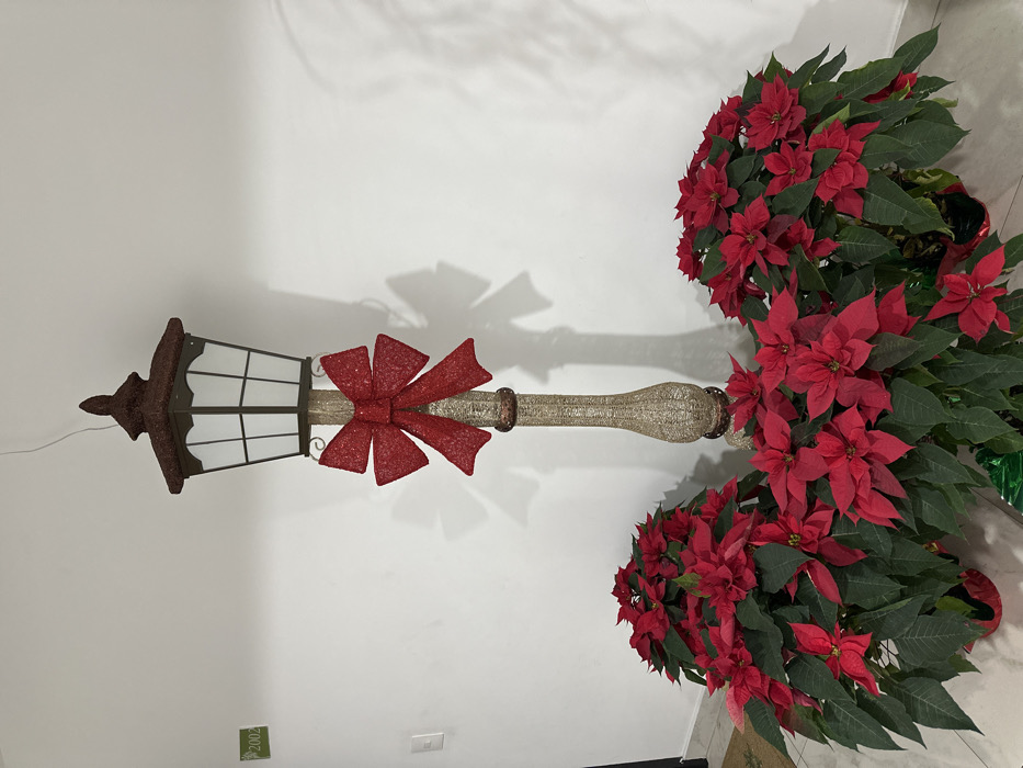 A sideways view shows a decorative holiday scene. A brown, ornate lamppost with a large red glittery bow sits horizontally across the image. On the right end of the lamppost, two large poinsettia plants with vibrant red bracts and lush green leaves stand. The scene is set against a plain white wall, with subtle shadows cast by the objects. The overall composition evokes a festive atmosphere.