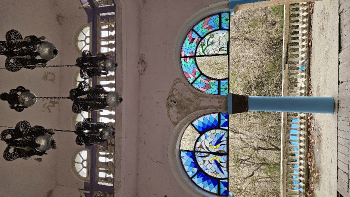 The image displays an interior perspective of a dilapidated structure, identified as a pavilion in Yerevan, Armenia. Six ornate, dark metal chandeliers, each featuring a spherical glass element, hang from a light pink ceiling that exhibits extensive paint peeling and visible cracks. Above the main level, a balcony with a white balustrade and several arched windows is visible. The mid-section features two prominent arched stained-glass windows. The left window is predominantly blue, depicting two yellow-bodied, blue-headed birds perched on a branch within a geometric pattern. The right window displays a stylized branch or tree design set against a background of green, light blue, and pink geometric shapes. These windows are separated by a light blue column with a dark capital. The surrounding pink wall is severely weathered, showing significant cracking and peeling decorative plasterwork. The foreground consists of a worn wooden floor with noticeable gaps between planks. Beyond this, an outdoor paved area is visible, scattered with wet fallen leaves and small puddles, indicating recent moisture. This area is bordered by a white balustrade, behind which a dense cluster of bare deciduous trees suggests a late autumn or early spring environment. A second light blue column is partially visible on the right side of the lower frame. No individuals or animals are present in the scene.