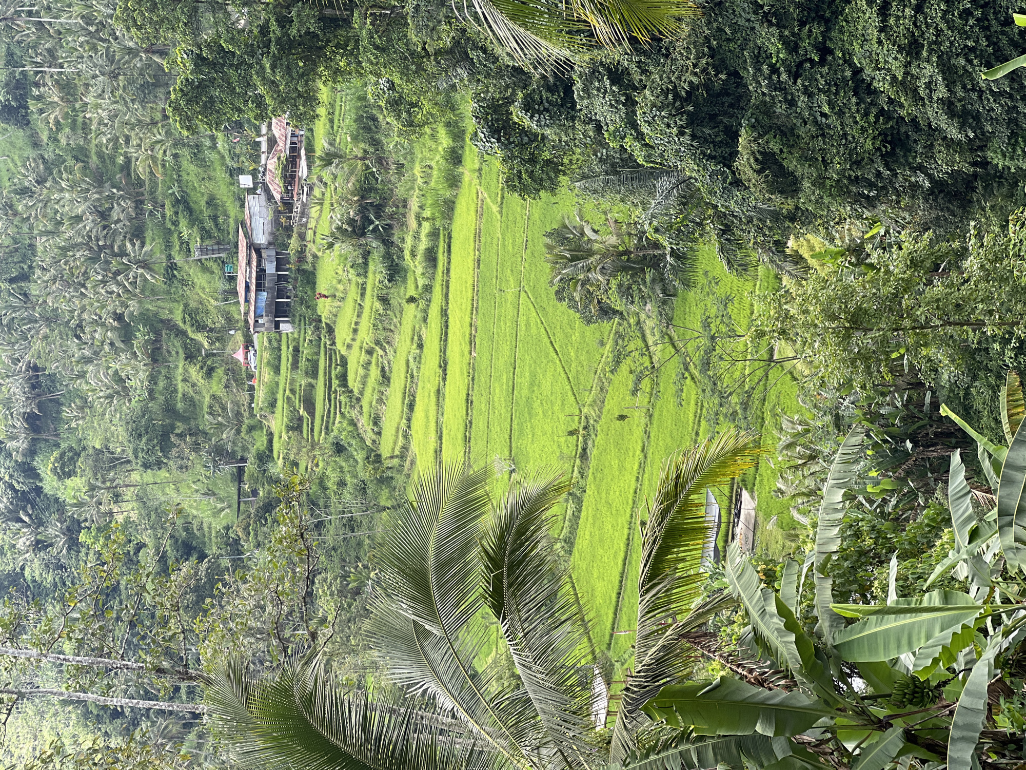This is an elevated, outdoor shot of a lush, green rice paddy field in Rendang, Indonesia