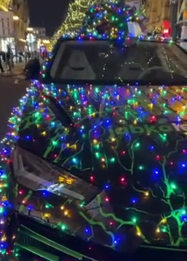 decorated Lamborghini parked on a city street at night. The car is covered in multi-colored Christmas lights and has a small Christmas tree strapped to its roof. The car has a green and black design underneath the lights and some text on the hood. In the background, there are buildings, streetlights, and other Christmas decorations, with a few people walking along the sidewalk.