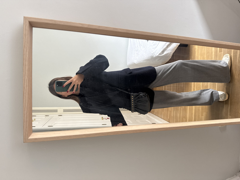 An individual is depicted taking a mirror selfie within a residential interior located in Madrid, Spain. The subject's face is obscured by a smartphone, held in the right hand, which features a dark green case. The individual wears a dark navy blazer, light grey wide-leg trousers, and white sneakers. A small, black, ruched crossbody bag with a line of gold-toned studs is worn across the left shoulder. Red nail polish is visible on the subject's right hand, along with a ring on the fourth finger. The mirrored reflection reveals a room with light-toned wooden flooring, a white or light wood paneled wardrobe with golden-colored handles, and a bed covered with a white duvet. The full-length mirror itself has a light natural wood frame and leans against a light grey wall.