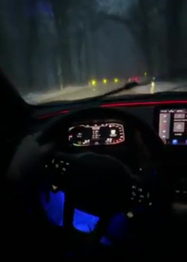 The video, shot from inside a car moving along a snow-covered road, shows the driver's perspective at night
