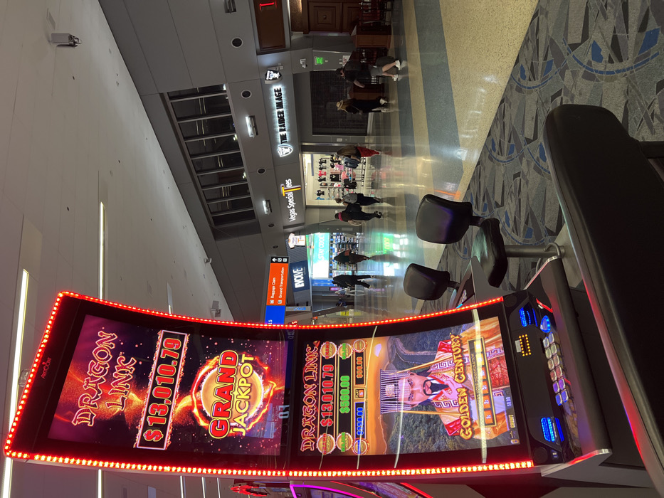 The scene depicts an interior view of a public concourse within Harry Reid International Airport, located in Paradise, Nevada, United States. In the left foreground, a 'Dragon Link' slot machine, themed 'Golden Century,' stands brightly illuminated. Its multiple digital screens display a "GRAND JACKPOT" amount of "$13,010.79" and an image of an East Asian figure. The machine features bright red LED trim along its edges and a control panel with various buttons and a coin slot at its base. Two black-upholstered stools with metal bases are positioned directly in front of the slot machine. The mid-ground and background reveal a spacious airport concourse with approximately ten individuals walking in various directions. Several retail storefronts are visible, including 'Vegas Special Tees' and 'The Raider Image,' and 'Evolve.' Directional signage points towards 'Baggage Claim' and 'Ground Transportation.' The environment features high, light-colored ceilings with integrated linear lighting fixtures, grey walls, and a combination of polished light-colored tiled flooring and dark blue and grey patterned carpet. High-set horizontal windows are visible along an upper section of the far wall. No direct interaction with the slot machine or specific individuals is discernible.