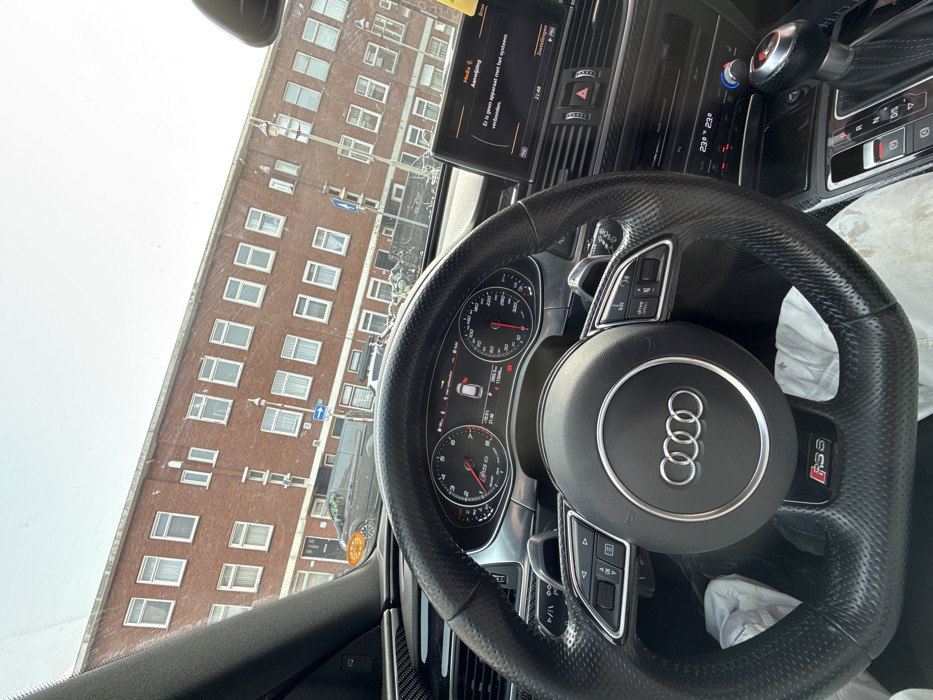 The image presents a view from the driver's seat of an Audi RS6, looking through the windshield onto an urban street scene in The Hague, Netherlands