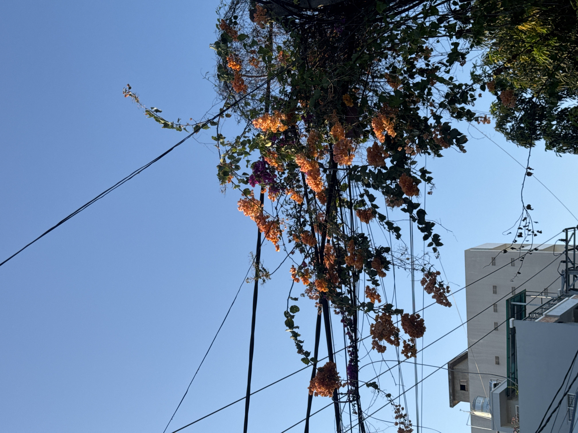 The image captures an urban overhead scene in Nha Trang, Vietnam, under a clear, unobstructed blue sky. A dense network of black utility wires extends across the frame, crisscrossing vertically and horizontally. A significant volume of flowering vine, primarily bougainvillea displaying clusters of orange-pink and some purple bracts, is heavily intertwined with these wires and surrounding green foliage, forming a large, irregular mass in the upper-right and central portions of the image. In the lower-left quadrant, parts of several buildings are visible: a multi-story, light-colored concrete structure with a flat roof and a small, square, concrete utility or access enclosure on its highest point. Below this, a lower building section features a metallic cylindrical water tank on a flat roof and a balcony or terrace covered by a green corrugated awning. Additional dark green tree foliage is present in the lower-right corner. The scene is uniformly illuminated by natural daylight. No individuals, animals, or specific actions are depicted.