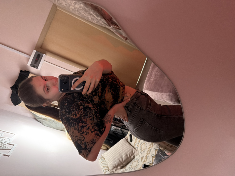 A female subject is depicted in a mirror selfie taken within an indoor residential room in Surgut, Russia. The subject, with light brown hair in a high ponytail, wears a black t-shirt with brown/orange bleach-like patterns and dark gray jeans. A floral tattoo is visible on her left forearm, and a small butterfly-like tattoo is on her lower back. She holds a dark-colored smartphone with a visible MagSafe ring on its case in her right hand, aimed towards the mirror. The room features light pink walls. Reflected elements include two white framed wall decorations, a bed or sofa with patterned bedding and pillows, a white electrical panel, a light brown door, and a light-colored curtain. A pink or purple cushion or seating element is also partially visible. The scene is illuminated by warm, artificial light.