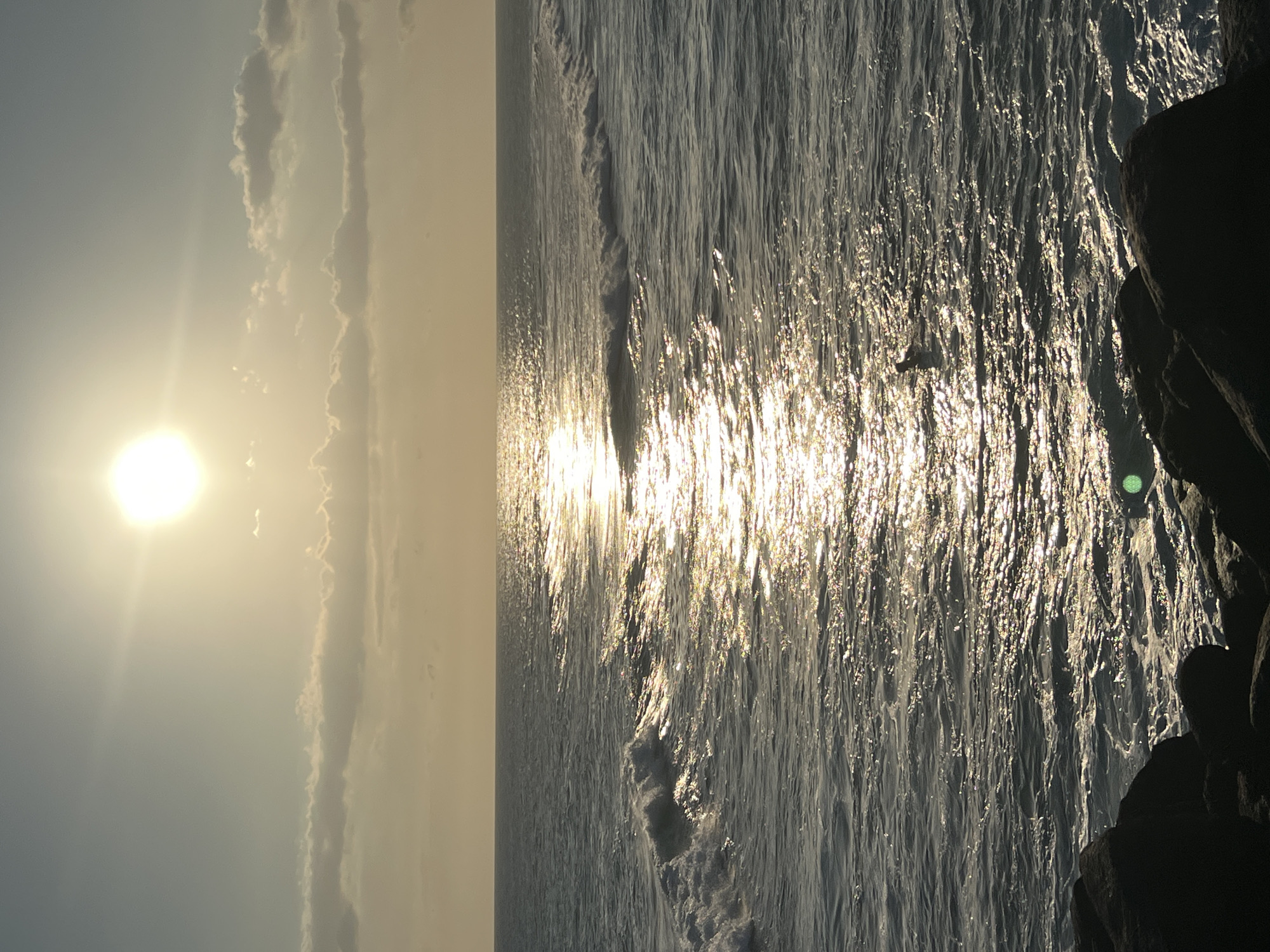 This image depicts a coastal scene in Goviyapana, Sri Lanka, during either sunrise or sunset. The sun, a brilliant white-yellow orb, is centrally positioned in the upper sky, casting a strong, shimmering golden reflection path across the ocean surface towards the viewer. The sky is a pale blue-grey with several horizontally elongated cloud formations below the sun's position. The ocean surface exhibits moderate waves, with some white foam visible on breaking crests, particularly on the left side of the sun's reflection. A single individual is present in the water in the lower-mid right section, largely silhouetted against the bright reflection. The person's head and upper torso are visible above the water, suggesting they are swimming or paddling on a board, oriented horizontally across the frame. In the extreme foreground, dark, irregularly shaped rocks, silhouetted against the water, are visible in the lower left and right corners. A distinct green circular lens flare is present in the lower right portion of the image.