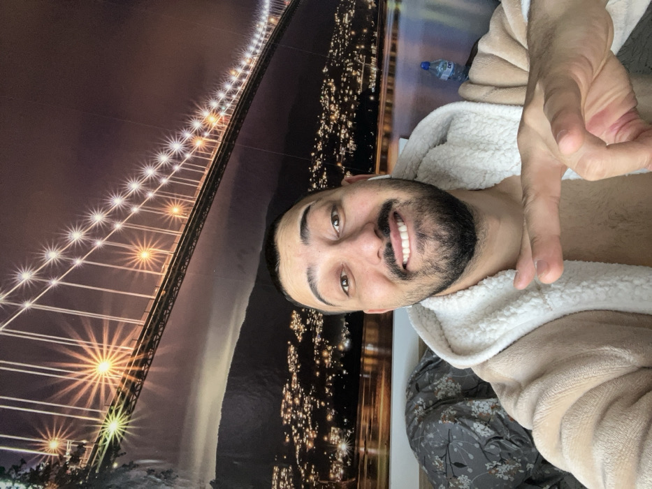 A male individual is depicted in a selfie, taken indoors, reportedly in the city of Shumata, Bulgaria. He is seen from the chest up, smiling directly at the camera with teeth visible. He has short dark hair, a beard, and a mustache, and wears a beige bathrobe with a white, fluffy interior. A white earbud is present in his left ear. His right hand is raised, with fingers splayed, pointing horizontally towards the left side of the frame. The background is a large wall mural depicting a night cityscape with a brightly lit suspension bridge over a body of water, flanked by illuminated urban areas on distant hills. To the lower left, grey patterned bedding is partially visible. To the lower right, a plastic water bottle with a blue label rests on an unseen surface.