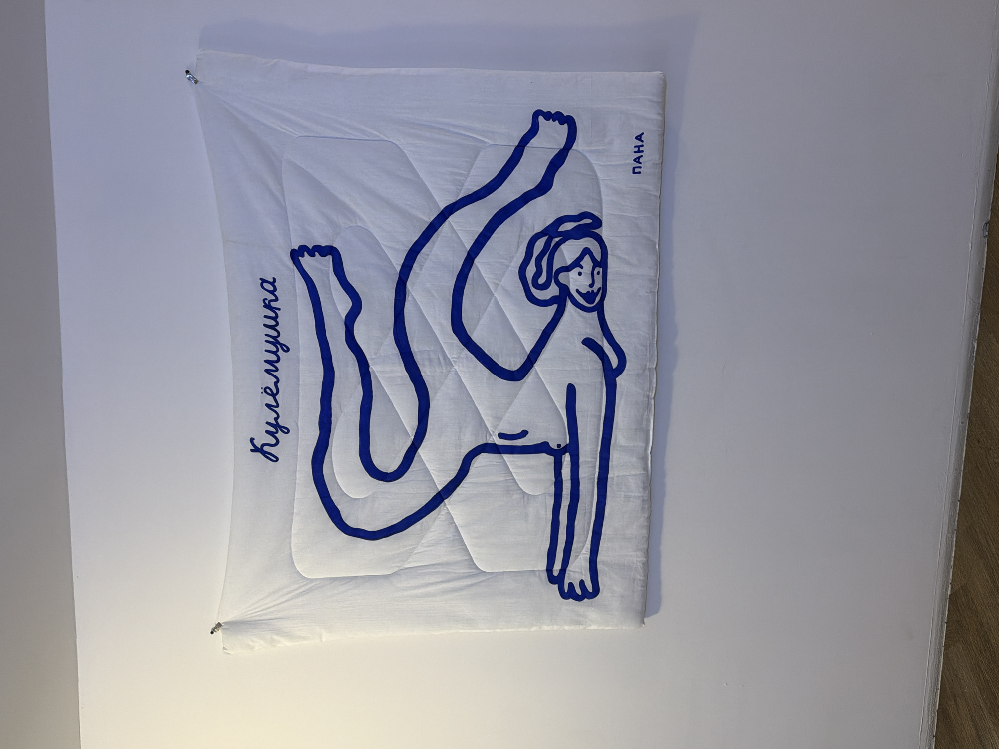 A rectangular, white quilted textile artwork is centrally displayed on a plain white wall in an interior setting in Moscow, Russia. The textile, measuring approximately 1.5 to 2 meters in width, features a continuous blue line drawing of a stylized human figure in a supine, contorted, or flexible pose, with legs bent and raised and arms extended. The figure's head is depicted in profile, facing left. The Cyrillic word "Кулёмушка" (Kulyomushka) is written in blue script in the upper left portion of the textile, and the Cyrillic word "ПАНА" (PANA) is present in blue block letters in the lower right corner. The artwork is secured to the wall at its top two corners by small, silver-colored metal clips. The wall is unadorned and painted white. A light brown wooden floor with horizontal planks is visible at the bottom of the frame. The scene is illuminated by uniform indoor lighting.