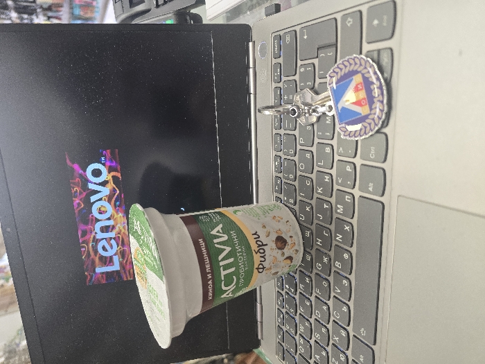 A grey Lenovo laptop, displaying its colorful "Lenovo" boot logo on a black screen, is positioned on a flat surface. A white Activía yogurt cup, labeled "КИНОА И ЛЕШНИЦИ" (Quinoa and Hazelnuts) and "ФИБРИ" (Fibres) in Cyrillic, with a green lid, rests upright on the laptop's Cyrillic keyboard. To the right of the yogurt cup, a keychain with two silver keys is also on the keyboard. The keychain fob is circular with a purple border, featuring a blue and red emblem depicting a stylized building and the Cyrillic letters "УАСГ" (UACG - University of Architecture, Civil Engineering and Geodesy) surrounded by a laurel wreath. The blurred background indicates an indoor environment, possibly a retail or cafeteria setting, with shelves displaying items and a dark grey desk phone or point-of-sale terminal visible on the far right. The presence of the UACG keychain places the scene in or immediately adjacent to the University of Architecture, Civil Engineering and Geodesy in Sofia, Bulgaria.