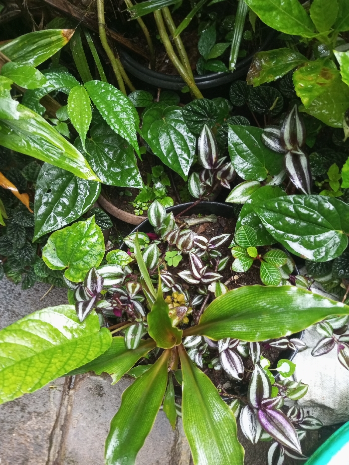 A vibrant assortment of plants fills the frame, primarily in shades of green, showcasing a variety of leaf shapes and textures. Notable are glossy heart-shaped leaves, striped foliage with silver and purple hues, and broad, ribbed leaves emanating from a central stalk. The plants are densely packed in pots, suggesting a cultivated arrangement outdoors. Moisture is evident on the foliage, possibly from recent rain, enhancing their lush appearance.