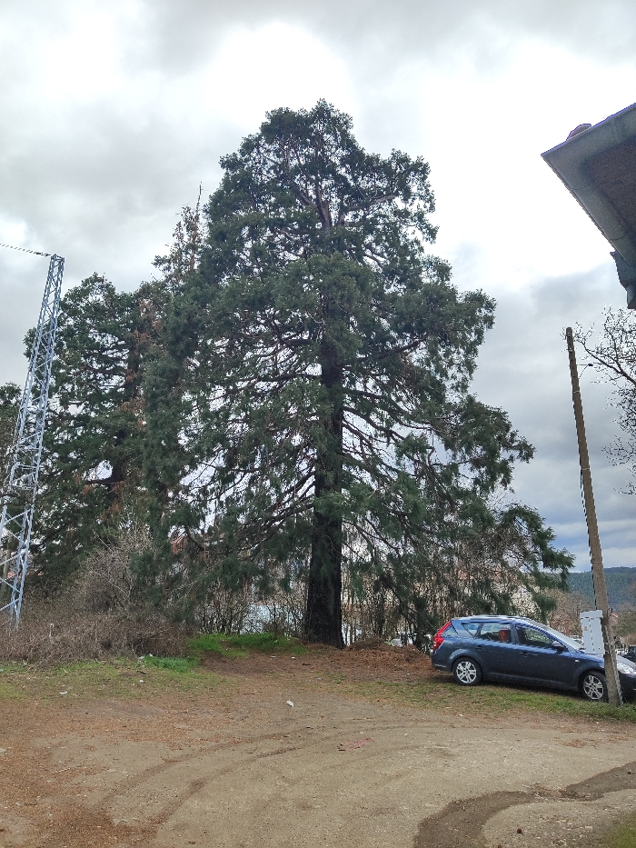 The image depicts an outdoor scene in the city of Pirdop, Bulgaria, under an overcast sky. A towering, mature conifer tree dominates the central and left portions of the frame, exhibiting dense, dark green foliage and prominent bark. To the immediate right of the tree, a dark blue or grey station wagon is parked on a slight incline, facing right, with its front end obscured by the tree's base and its rear wheels visible on a grassy patch. A slender utility pole stands upright to the right of the parked vehicle. In the upper right quadrant, the dark-tiled roof and an architectural detail of a building are visible. On the far left, a metallic lattice communication tower is partially visible, with a wire extending horizontally from its upper section. The foreground consists of an unpaved, dirt ground with discernible tire tracks and scattered debris. Beyond the main tree and car, denser vegetation and forested hills are visible in the background. No individuals or active interactions are present in the scene.