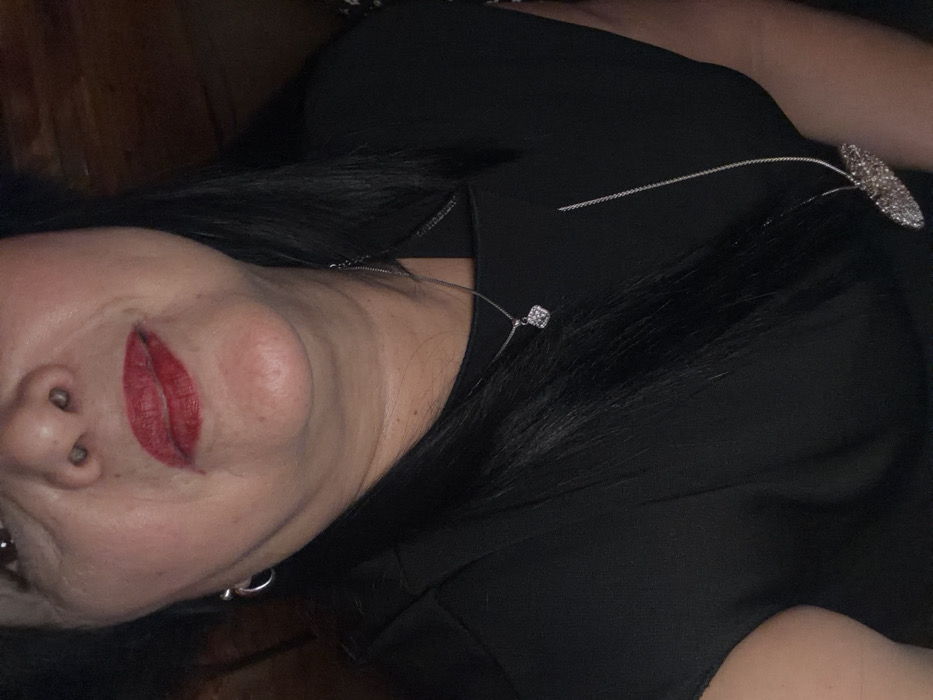 A woman lies on her side, facing the camera. She wears a black top and bright red lipstick. Her dark hair falls around her face. She has silver hoop earrings and a silver necklace with a square pendant. A longer silver necklace with a large, decorative embellishment is visible on her chest. The background appears to be a dark, wooden surface.