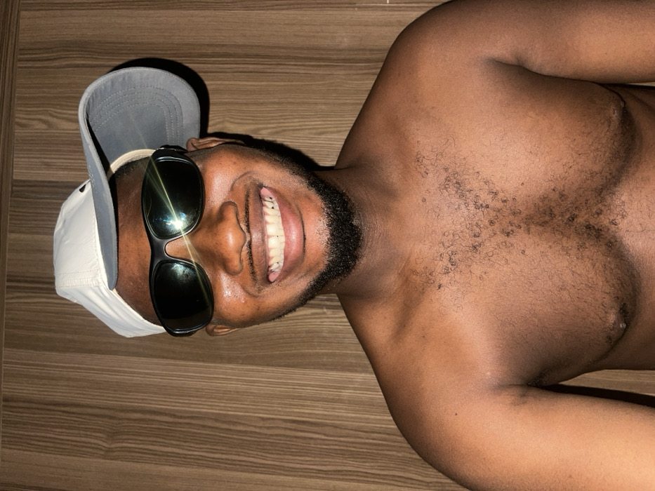 A topless man with a beard and mustache is lying on a wooden surface. He is wearing a white cap with a gray bill, and dark sunglasses with a glare on the lenses. The man is smiling, exposing his upper teeth. His chest is tan and slightly hairy. The image is oriented horizontally.