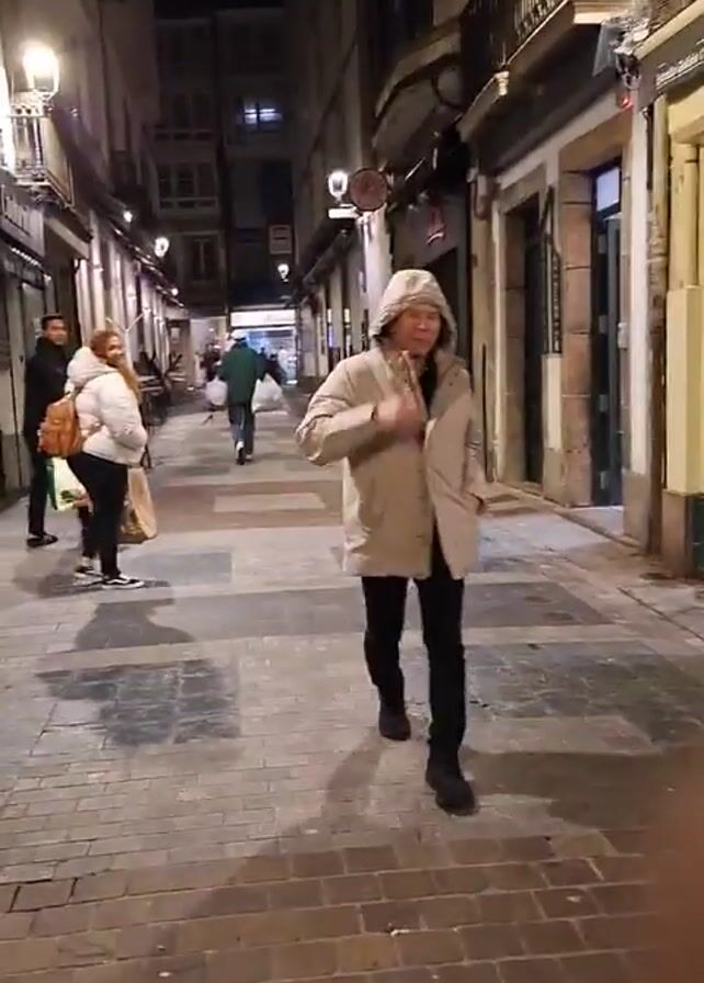 A man wearing a beige hooded jacket and black pants walks toward the camera on a cobblestone street in an urban environment at night. Other pedestrians are visible in the background, and shops line the sides of the street. The man smiles as he walks. The street is illuminated by streetlights.