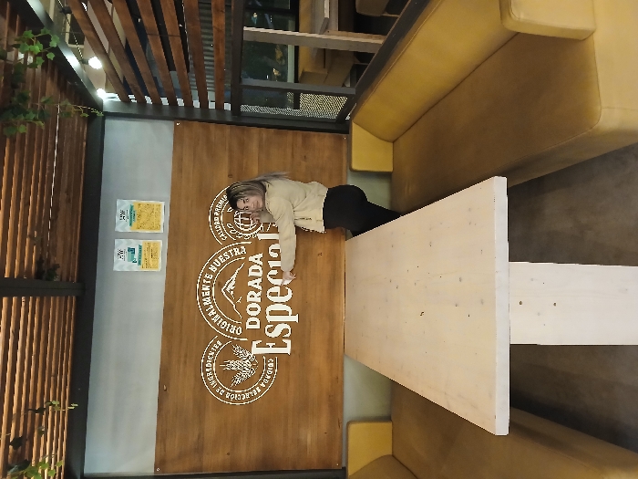 A woman in a beige jacket and black pants leans against a wooden wall with the words "DORADA Especial" printed on it. There are two small posters on the wall to the left of her. The scene appears to be inside a restaurant, with a light-colored wooden table extending outward and yellow booth seating surrounding it. Slatted wooden construction overhead suggests a partial roof.
