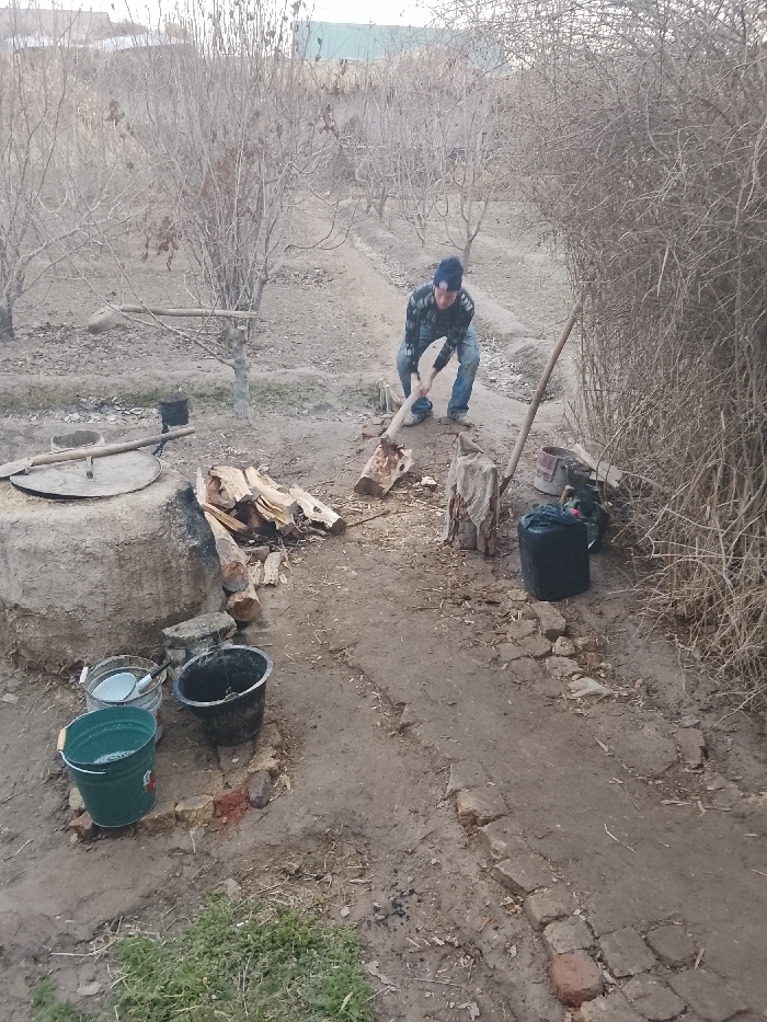 The image depicts an outdoor scene in Qoraqosh, Uzbekistan, showing a man engaged in wood splitting