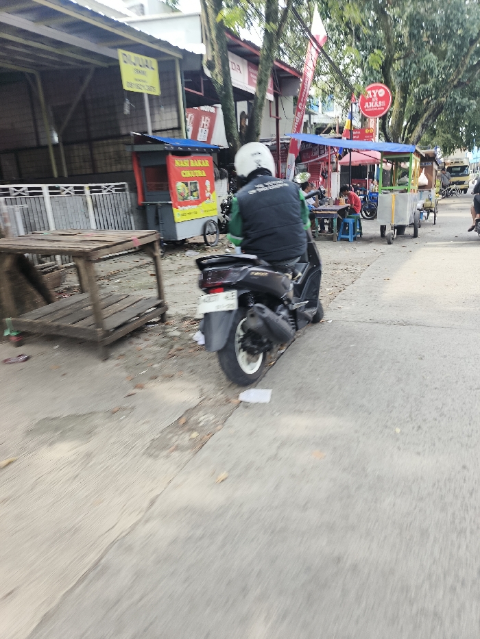 This image captures a street scene in Bandung City, Indonesia, during daylight hours. In the foreground, a person wearing a white helmet and a dark vest over a green shirt is seated on a dark-colored Yamaha NMAX scooter, identifiable by its license plate D 4800 KES, which signifies its registration in the Bandung area. The scooter is positioned on a concrete pavement exhibiting cracks and scattered debris. To the left of the scooter, a weathered wooden two-tiered stand rests on the ground. In the midground, multiple street vendor setups are present. On the left, a food cart with a blue awning and a red base advertises "Nasi Bakar Cikur" with contact information. Behind this cart, a building with a corrugated metal roof displays a yellow "DIJUAL" (FOR SALE) sign. Further to the right, two individuals are seated on blue plastic stools at a low table, engaged in eating. Additional vendor carts with blue tarpaulin awnings are visible along the street. Building facades display signs, including a "Honda" logo, and red and white flags are vertically strung. A circular red sign prominently features the word "AYO." The background reveals more urban structures, dense green tree foliage, and the partial view of a white truck positioned further down the street. The scene indicates active street commerce and pedestrian presence.