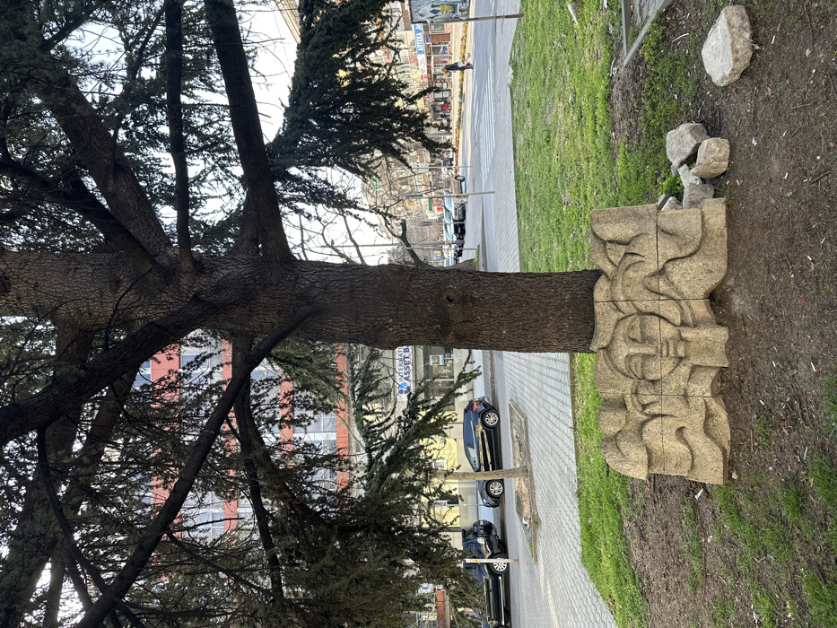 This image depicts an urban green space situated alongside Bulevard "Tsar Simeon Veliki" in Stara Zagora, Bulgaria. The central focus is a large, mature coniferous tree with a textured trunk and widespread branches, beneath which a low, multi-panel stone sculpture is positioned. The sculpture features stylized relief carvings of faces and abstract forms. Several irregular, loose stone fragments lie on the ground immediately to the right of the sculpture. The green space consists of sparse grass and exposed soil. To the left of the tree, a grey paved pedestrian path transitions into a street with parked vehicles, including two dark-colored SUVs. To the right of the tree, a wider street features a marked pedestrian crosswalk. In the midground, a lone individual is visible walking away from the viewer on the far side of the street, near the curb. The background reveals an urban landscape dominated by multi-story buildings. A prominent structure directly across the street houses "International Asset Bank," identifiable by its signage, and features a red-orange upper facade with numerous windows. Further along the street to the right, other commercial establishments are visible, including one with "АПТЕКА" (Pharmacy) written in Cyrillic. The sky is bright with light cloud cover, indicating daytime.
