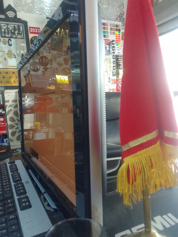 The image displays an interior scene, likely a business office or retail establishment, photographed from a low, slightly upward angle. In the foreground, a black computer keyboard, possibly HP branded, occupies the lower-left corner. A dark cup is partially visible below the keyboard. A large, dark-screened computer monitor dominates the left half of the frame, functioning as a reflective surface. Its screen reflects various objects from the room, including: a bright yellow square sign with a prominent circular "1"; a large, orange, three-dimensional letter "S"; a red sign with "2023"; multiple decorative plaques and awards featuring intricate geometric designs, deer silhouettes, and other patterns; and a white sheet of paper with indistinct text. The reflected background shows a light-colored wall adorned with numerous small, circular medallions. To the right of the monitor, a small red desk flag, embellished with gold trim and yellow fringe, is displayed on a golden stand. This flag rests on a dark, textured desk surface. Behind the flag, a black office chair with a metallic frame is partially visible. The wall behind the chair is covered with a collection of square and rectangular printed materials, including color swatches and posters displaying Arabic script, with the word "Enseq" discernible on some. An overexposed light source, suggesting a window or doorway, is present in the far-right background. No individuals are directly visible in the image. The presence of Arabic script on the printed materials indicates a location where Arabic is spoken, consistent with Meknes, Morocco. However, no specific landmarks or external identifiers are present to precisely locate the scene within the city.