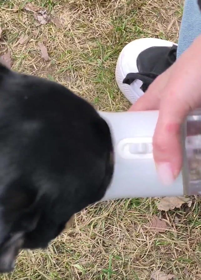 black dog being offered water from a portable water bottle