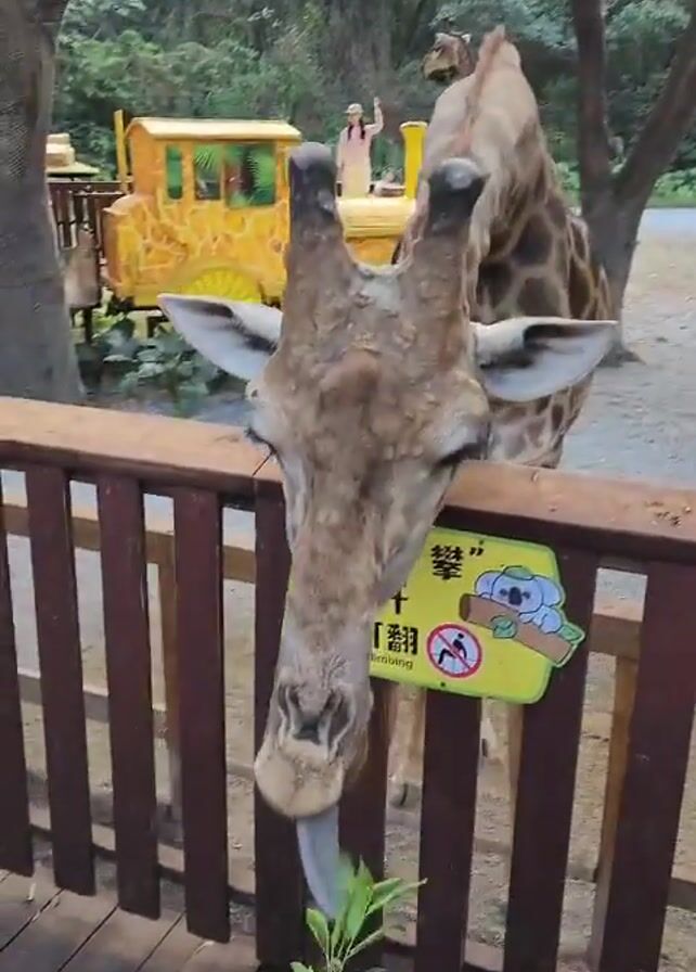 giraffe reaching over a wooden fence to eat leaves being offered by a person. The giraffe has a long neck and a brown and white patterned coat. There's another giraffe behind it. A sign on the fence reads "人生可攀 欄杆不可翻" and "No Climbing," with a picture of a koala. In the background, there's a yellow train-shaped structure and a woman standing near it waving. The setting appears to be a park or zoo with trees and greenery.