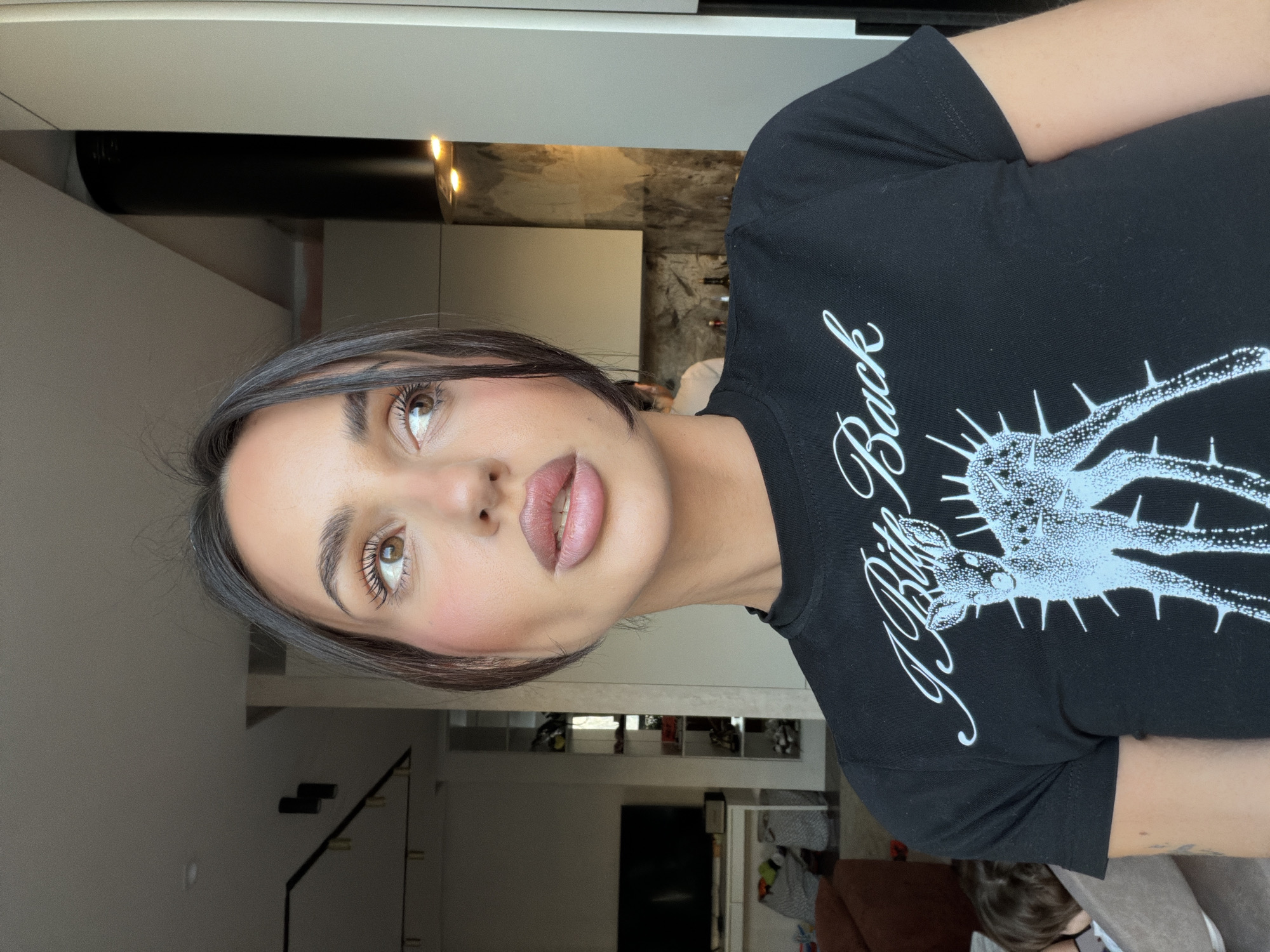The image portrays an indoor residential scene in Khimki, Russia, featuring a primary female subject in the foreground within a modern open-plan living space. The female, positioned center-frame, has dark hair, brown eyes, and is looking upwards and to the right. She wears a black short-sleeved t-shirt with the text "I Bite Back" and a graphic of a spiky deer in light blue on the chest. Her face exhibits visible makeup, including blush and full lips. In the blurred background to the left, a small child with dark hair is partially visible from behind, seated on a brown sofa. Adjacent to the sofa is a white stand supporting a large, dark flat-screen television. A tall, narrow shelving unit containing various items is also visible. Further into the background, a modern kitchen area is discernible on the right, equipped with light-colored cabinetry, a prominent black cylindrical range hood, and warm-toned accent lighting illuminating a textured backsplash. A blurred figure is indistinctly visible in the kitchen area. The walls are predominantly light-colored, and linear ceiling lighting fixtures are present in the living area.
