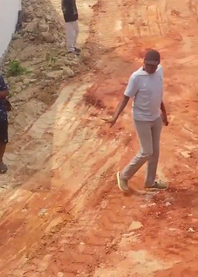 construction site with three men. One man is standing near a white wall, appearing to take pictures. Another man is in the background, holding something to his ear. The main subject is a man in a gray shirt and cap, walking across a reddish-brown dirt area that shows tire tracks. The camera's viewpoint is from above and slightly behind a concrete block or structure. The sound of heavy machinery is present.