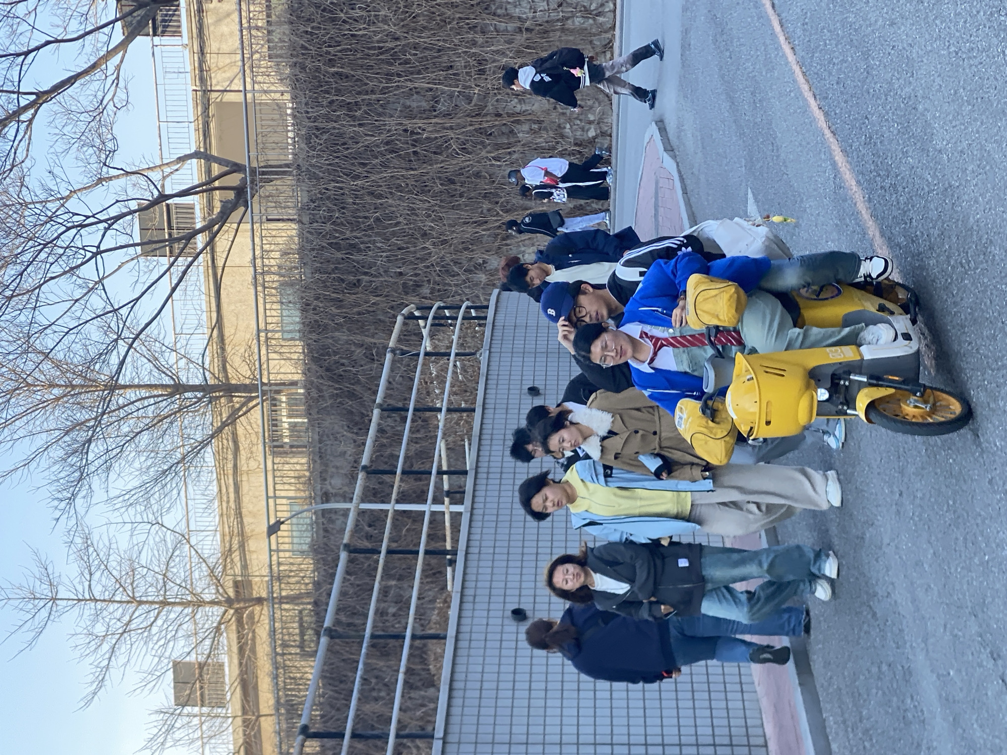 A group of approximately 10 people, including men and women dressed in casual clothes, are gathered in what appears to be a public space in Zhongtun, China. They are located next to a low, gray wall topped with a metal railing, with a bare tree visible in the background. Some of the people are on or near a yellow, wheeled platform or cart, possibly an electric scooter. A few individuals are walking away from the group. The scene is set outdoors on a clear day. The location has a sidewalk and a street.