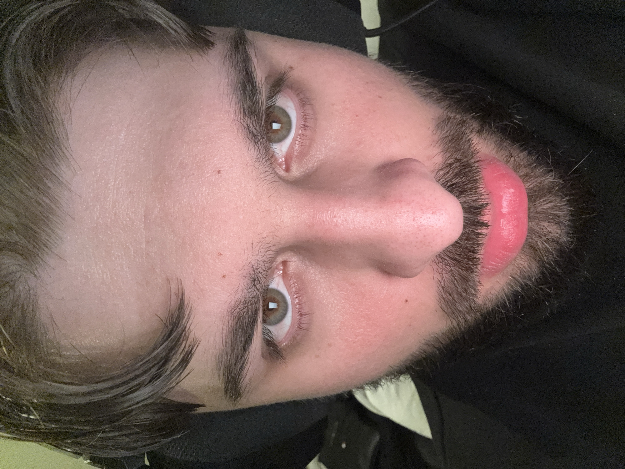 The image displays a close-up, head-on portrait of a male subject, encompassing his face from the forehead to the upper lip. The subject has dark, medium-length hair with a slight forelock over the forehead. His eyes appear light brown or hazel, with visible reflections of a light source. He possesses prominent, dark eyebrows. The skin is light-toned, exhibiting some redness on the cheeks and nose, along with visible pores. A short, dark beard or heavy stubble covers the chin and jawline, connecting to a mustache above full, glossy lips that appear bright pink-red. The subject is wearing dark headphones, partially visible on either side of his head, and a black garment. The background is uniformly dark and out of focus, indicating an indoor setting with minimal discernible detail. No specific landmarks or environmental cues are present to identify a particular location within Varna, Bulgaria.