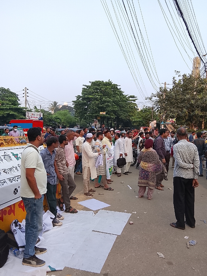 This image captures a public gathering on a paved street in Dhaka, Bangladesh