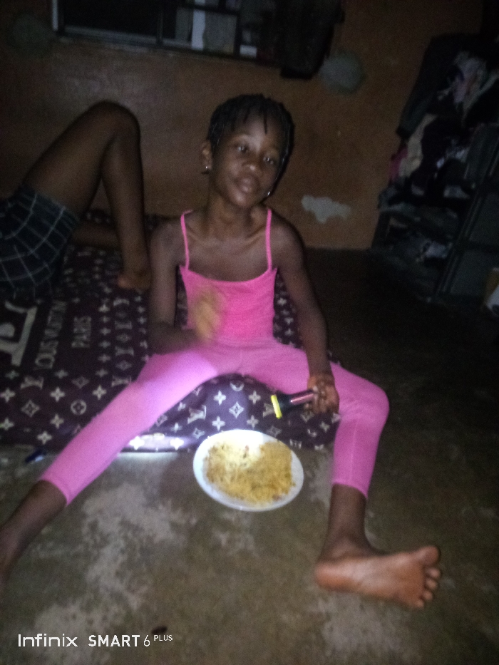 A young girl wearing a pink tank top and leggings sits cross-legged on a patterned blanket. A plate of food rests in front of her, and she holds a flashlight in her hand. A pair of legs are visible in the upper left corner of the image. Clothing is hanging on a rack in the background. The floor appears to be concrete. An "Infinix SMART 6 PLUS" watermark is visible in the lower left corner.