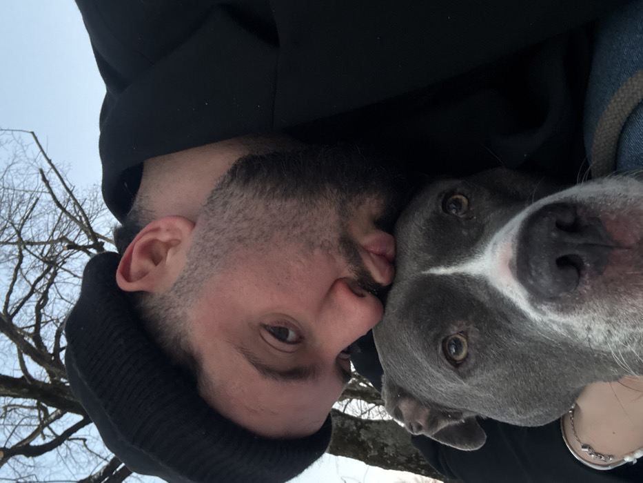 An adult male and a blue-gray and white canine are depicted in a close-up outdoor portrait. The male, positioned on the upper left, wears a black ribbed beanie and a dark-colored coat. His visible right eye is brown, and he has a short beard. His lips are pursed and pressed against the top of the dog's head. A silver-toned bracelet is visible on his left wrist. The canine, a Pitbull-type dog, is primarily blue-gray with a white muzzle, forehead blaze, and chest. Its eyes are amber-brown, and it is looking directly at the camera. The background consists of bare tree branches against a light blue sky, indicating an outdoor, possibly cold-weather, environment. This scene is located in the city of Esch-sur-Alzette, Luxembourg.